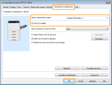 Ouvrez le dossier des imprimantes (Affichage du dossier des imprimantes)  Cliquez avec le bouton droit sur l'icône de votre imprimante  [Propriétés de l'imprimante] ou [Propriétés]  Onglet [Paramètres du périphérique]  Réglez l'option à utiliser  [OK]