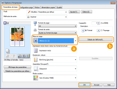 Vous ne pouvez pas sélectionner les paramètres de format d'affiche si l'impression recto verso est activée. Sélectionnez [Impression recto], dans [Impression recto/recto verso/au format brochure ], puis sélectionnez un paramètre de format d'affiche.