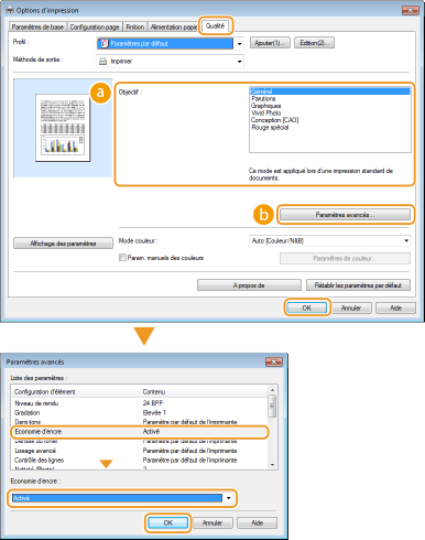 Onglet [Qualité] Sélectionnez le type de document dans [Objectif] Cliquez sur [Paramètres avancés] Sélectionnez [Economie d'encre] dans l'écran [Paramètres avancés] Sélectionnez [Activé] dans la liste déroulante [OK] [OK]