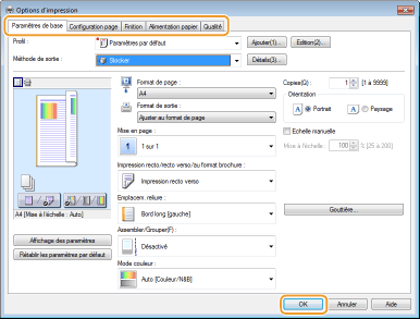 Cliquez sur l'onglet [Paramètres de base], [Configuration page], [Finition], [Alimentation papier] ou [Qualité] pour spécifier les réglages d'impression sur chaque écran, le cas échéant.