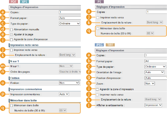 Spécification des réglages d'impression pour les fichiers XPSDécochez la case [Choisir la priorité de la fiche d'impression]. Si la case est cochée, certaines options ne sont pas disponibles.