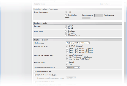 Un profil RGB similaire à un profil moyen de la plupart des moniteurs d'ordinateurs sous Windows est utilisé. L'utilisation d'un moniteur prenant en charge sRGB permet d'imprimer des couleurs proches des couleurs affichées à l'écran.