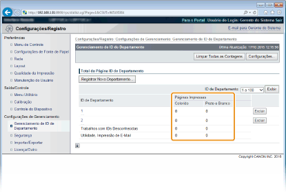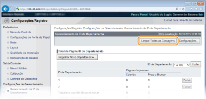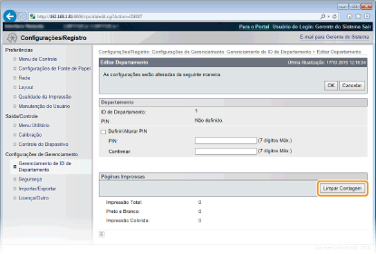 Para zerar a contagem de páginas de cada departamento, clique no link de texto em [ID de Departamento] e clique em [Limpar Contagem]  [OK].