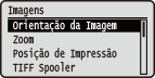 Todas as definições sobre arquivos de imagem (JPEG e TIFF) disponíveis para Impressão Direta USB, Impressão Direta e Impressão de E-mail estão listadas com descrições curtas. As predefinições estão marcadas com uma cruz (