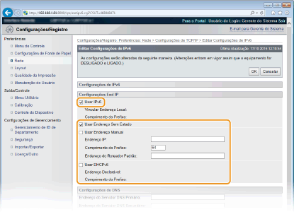 Seleção de configurações no painel de operaçãoVocê também pode ativar ou desativar os endereços IPv6 no menu de configuração do painel de operação. Configurações IPv6