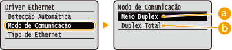 Selecione <Meio Duplex> ou <Duplex Total> ![]() ![]() <Meio Duplex>Envia e recebe dados de comunicação de forma alternativa. Selecione-a quando a máquina estiver conectada a um dispositivo de rede usando meio duplex.