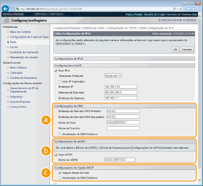 Marque a caixa de seleção para atualizar dinamicamente os registros DNS sempre que o endereço IP da máquina é alterado. Para especificar o(s) tipo(s) de endereços que deseja registrar no servidor DNS, marque a caixa de seleção para [Registrar Endereço Manual], [Registrar Endereço Declarável] ou [Registrar Endereço Sem Estado]. [Configurações de mDNS]/[Configurações de Opção DHCP][Usar mDNS]