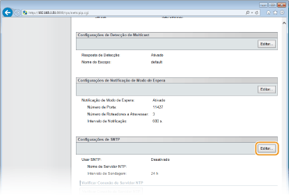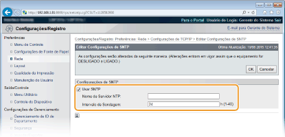 Testando a comunicação com o servidor NTP/SNTPVocê pode visualizar o status de comunicação com o servidor registrado clicando em [Configurações/Registro]