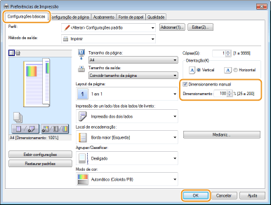 As configurações de ampliação/redução em alguns aplicativos possuem prioridade sobre as configurações do driver de impressora.