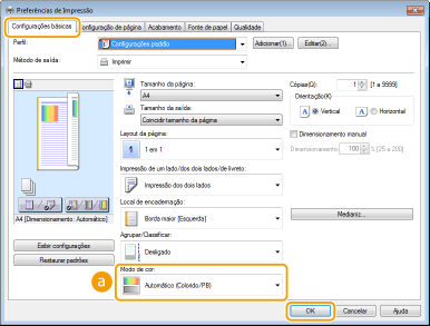 Você pode selecionar um modo cor (colorido ou preto e branco). Se um documento possuir páginas coloridas e em preto e branco, especificando o modo automático, as páginas coloridas são impressas em cores e as páginas em brancas são automaticamente impressas em preto e branco.