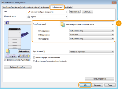 Selecione as páginas a imprimir em papel diferente e a fonte de papel carregada com o papel a partir de [Seleção do papel]