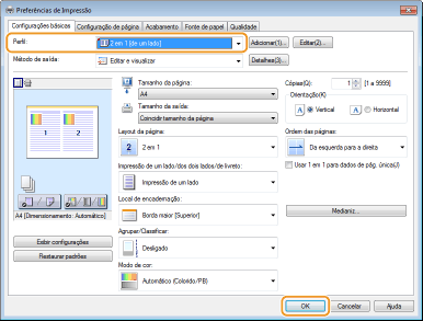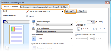 Clique nas guias [Configurações básicas], [Configuração de página], [Acabamento], [Fonte de papel] ou [Qualidade] para especificar em cada tela conforme necessário.