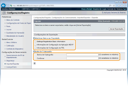 Digite a senha para codificar os dados a serem exportados usando até 32 caracteres. Digite a mesma senha em [Confirmar]. Se nenhuma senha for definida, a exportação de dados não ocorrerá.