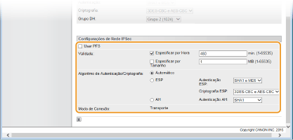 Antes de configurar as definições de comunicação IPSecVerifique as configurações de IPSec no sistema operacional com o qual a máquina irá se comunicar. Uma combinação incorreta de configurações de sistema operacional e configurações da máquina irá desativar a comunicação IPSec.