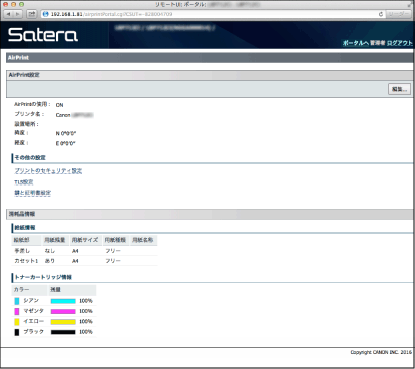 AirPrint専用ページからAirPrintの設定画面を表示したり、用紙やトナーカートリッジなどの消耗品の状態を確認したりすることができます。また、セキュリティー機能の設定(