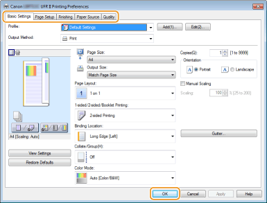 Click the [Basic Settings], [Page Setup], [Finishing], [Paper Source], or [Quality] tabs to specify the print settings on each screen as necessary.