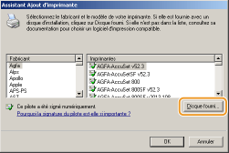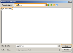 Spécifiez le dossier contenant les pilotes d'imprimante, sélectionnez le fichier INF puis cliquez sur [Ouvrir].