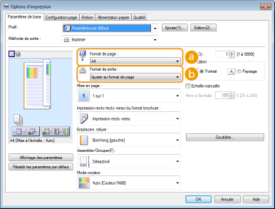 Vous pouvez, de façon simple et intuitive, définir la mise en page ou encore la position de reliure dans l'aperçu. Pour en savoir plus, cliquez sur [Aide], dans l'écran du pilote d'imprimante.