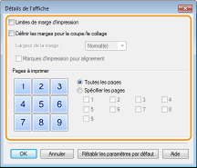 L'écran suivant permet de faire les réglages pour les bordures et les marges de collage. Pour en savoir davantage, cliquez sur [Aide] dans l'écran du pilote d'imprimante.