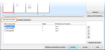 Dans la liste [Nom du document], sélectionnez la tâche d'impression combinant les documents et cliquez sur .