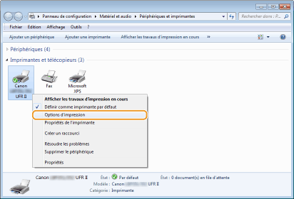 Cliquez avec le bouton droit sur l'icône de votre imprimante, puis cliquez sur [Options d'impression].