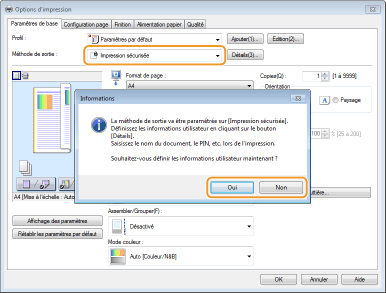 Sélectionnez [Impression sécurisée], dans [Méthode de sortie].