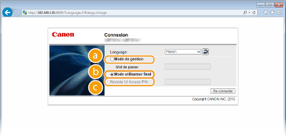 Sélectionnez [Mode de gestion] ou [Mode utilisateur général], puis saisissez une valeur dans [PIN d'accès à l'IU distante].