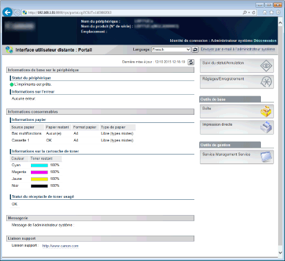Vous pouvez effectuer toutes les opérations et tous les réglages depuis l'interface utilisateur distante. Saisissez le mot de passe d'administrateur système approprié dans [Mot de passe].