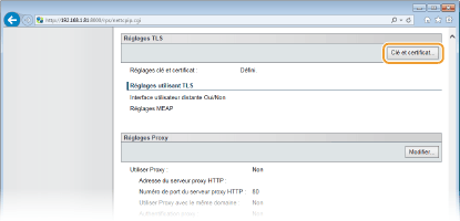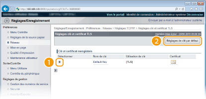 Si TLS est déjà activé par [Réglages de l'interface utilisateur distante] ou [Réglages impression IPP], [Réglages de clé par défaut] n'est pas affiché. Pour changer la clé à utiliser, reportez-vous à l'étape 6 et décochez les cases [Utiliser TLS] sous, respectivement, [Réglages de l'interface utilisateur distante] ou [Réglages impression IPP].
