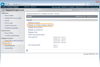 Cliquez sur [Sécurité]  [Réglages de l'interface utilisateur distante].