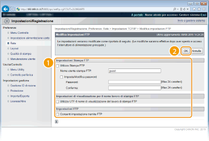 Selezionare la casella di controllo per consentire di modificare le impostazioni della macchina tramite client FTP. Se le modifiche alle impostazioni non sono ammesse, deselezionare la casella di controllo.