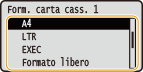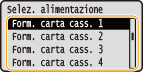 <Le opzioni da Form. carta cass. 2> a <Form. carta cass. 4> vengono visualizzate quando è installato l'alimentatore carta opzionale.