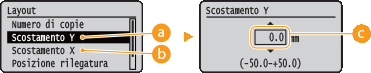 È possibile selezionare <Reg. posiz. stampa> sotto <Manutenzione utente> per specificare con precisione la posizione di stampa per ciascuna alimentazione carta. L'intervallo disponibile per i valori di scostamento è da da -5,0 a +5,0 mm in direzione verticale e da da -2,25 a +2,25 mm in direzione orizzontale. Regolazione della posizione di stampa