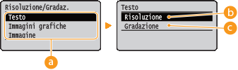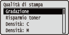 Le impostazioni relative alla qualità di stampa, incluse la gradazione e la densità del toner, vengono elencate con brevi descrizioni. Le impostazioni predefinite sono contrassegnate con una croce (