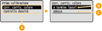 Le impostazioni relative alla regolazione della macchina, inclusi la correzione della posizione di stampa per ciascuna alimentazione carta e il miglioramento della qualità di stampa, vengono elencate con brevi descrizioni. È possibile specificare tali impostazioni quando la macchina è offline. Le impostazioni predefinite sono contrassegnate con una croce (