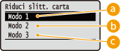 Asterischi (*)Le impostazioni contrassegnate da un asterisco (*) non vengono visualizzate in base ad altre impostazioni e in base all'eventuale installazione dell'alimentatore carta o della scheda SD (entrambi elementi opzionali) sulla macchina.