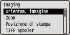 Tutte le impostazioni relative ai file di immagine (file JPEG e TIFF) disponibili per USB Direct Print, Direct Print e Stampa e-mail vengono elencate con brevi descrizioni. Le impostazioni predefinite sono contrassegnate con una croce (