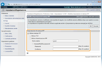 [Utilizzo Autenticazione IPP] Quando si usa la funzione di autenticazione utente per la stampa IPP, selezionare la casella di controllo e impostare nome utente e password. Quando non si usa, deselezionare la casella di controllo.