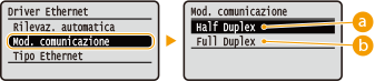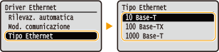 Selezionare il tipo di Ethernet ![]() ![]() ![]() Quando si seleziona <1000 Base-T>, l'impostazione per <Mod. comunicazione> diventa <Full Duplex>.