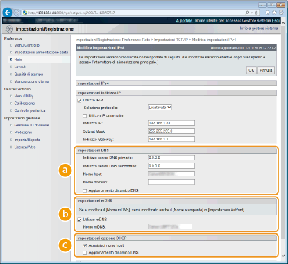 Selezionare la casella di controllo per aggiornare dinamicamente i record DNS quando viene modificato l'indirizzo IP della macchina. [Impostazioni mDNS][Utilizzo mDNS]