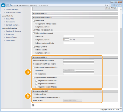 Selezionare la casella di controllo per aggiornare in modo dinamico i record DNS qualora cambi l'indirizzo IP della macchina. Per specificare i tipi di indirizzi da registrare nel server DNS, selezionare la casella di controllo per [Registra indirizzo manuale], [Registra indirizzo stateful] o [Registra indirizzo stateless]. [Impostazioni mDNS]/[Impostazioni opzione DHCP][Utilizzo mDNS]