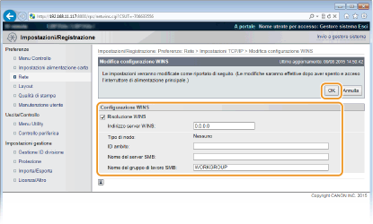 Se l'indirizzo IP del server WINS viene ottenuto da un server DHCP, l'indirizzo IP ottenuto ha precedenza sull'indirizzo IP immesso nella casella di testo [Indirizzo server WINS].