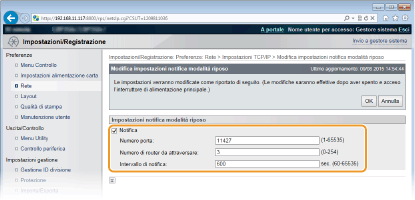 È possibile facilitare la raccolta e la gestione di varie informazioni sui dispositivi di rete implementando un software di gestione dei dispositivi, ad esempio imageWARE Enterprise Management Console, nella rete. Informazioni come impostazioni di dispositivo e registri di errore sono recuperati e distribuiti attraverso il server. Se la macchina è collegata a questo tipo di rete, imageWARE Enterprise Management Console cerca la macchina nella rete utilizzando protocolli come Service Location Protocol (SLP) per raccogliere informazioni dalla macchina, compreso lo stato di alimentazione. Le impostazioni SLP possono essere specificate attraverso la IU remota.