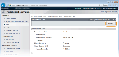 Un nome di gruppo di lavoro impostato in [Nome del gruppo di lavoro SMB] sotto [Configurazione WINS] viene automaticamente usato per [Nome gruppo di lavoro], se presente. Una modifica al nome del server in [Nome gruppo di lavoro] viene applicata anche a [Nome del gruppo di lavoro SMB] sotto [Configurazione WINS].