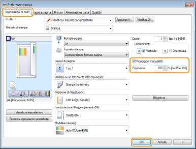 Le impostazioni di ingrandimento/riduzione di alcune applicazioni sono prioritarie su quelle del driver stampante.