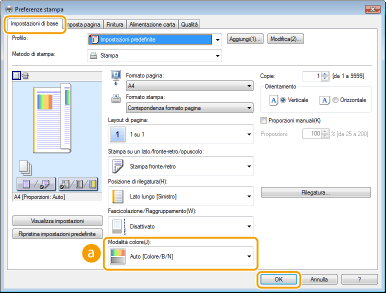 È possibile selezionare un modo colore (colori o bianco e nero). Se un documento contiene pagine a colori e in bianco e nero, specificando la modalità automatica, le pagine a colori vengono stampate a colori e le pagine in bianco e nero stampate automaticamente in bianco e nero.