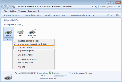 Fare clic con il pulsante destro del mouse sull'icona della stampante, quindi fare clic su [Preferenze stampa].