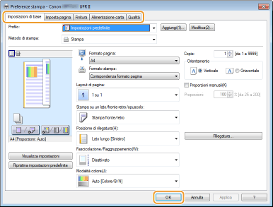 Fare clic sulle schede [Impostazioni di base], [Imposta pagina], [Finitura], [Alimentazione carta] o [Qualità] per specificare le impostazioni di stampa per ogni schermata, in base alle esigenze.