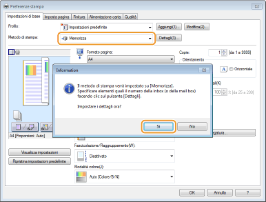 Selezionare [Memorizza] in [Metodo di stampa] e fare clic su [Sì].
