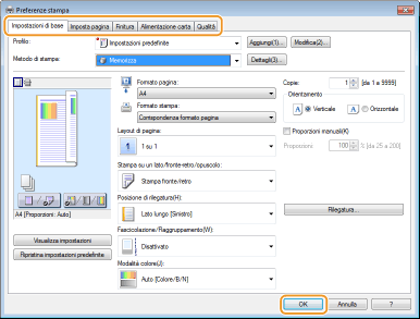 Fare clic sulla scheda [Impostazioni di base], [Imposta pagina], [Finitura], [Alimentazione carta] o [Qualità] per specificare le impostazioni di stampa per ogni schermata, in base alle esigenze.